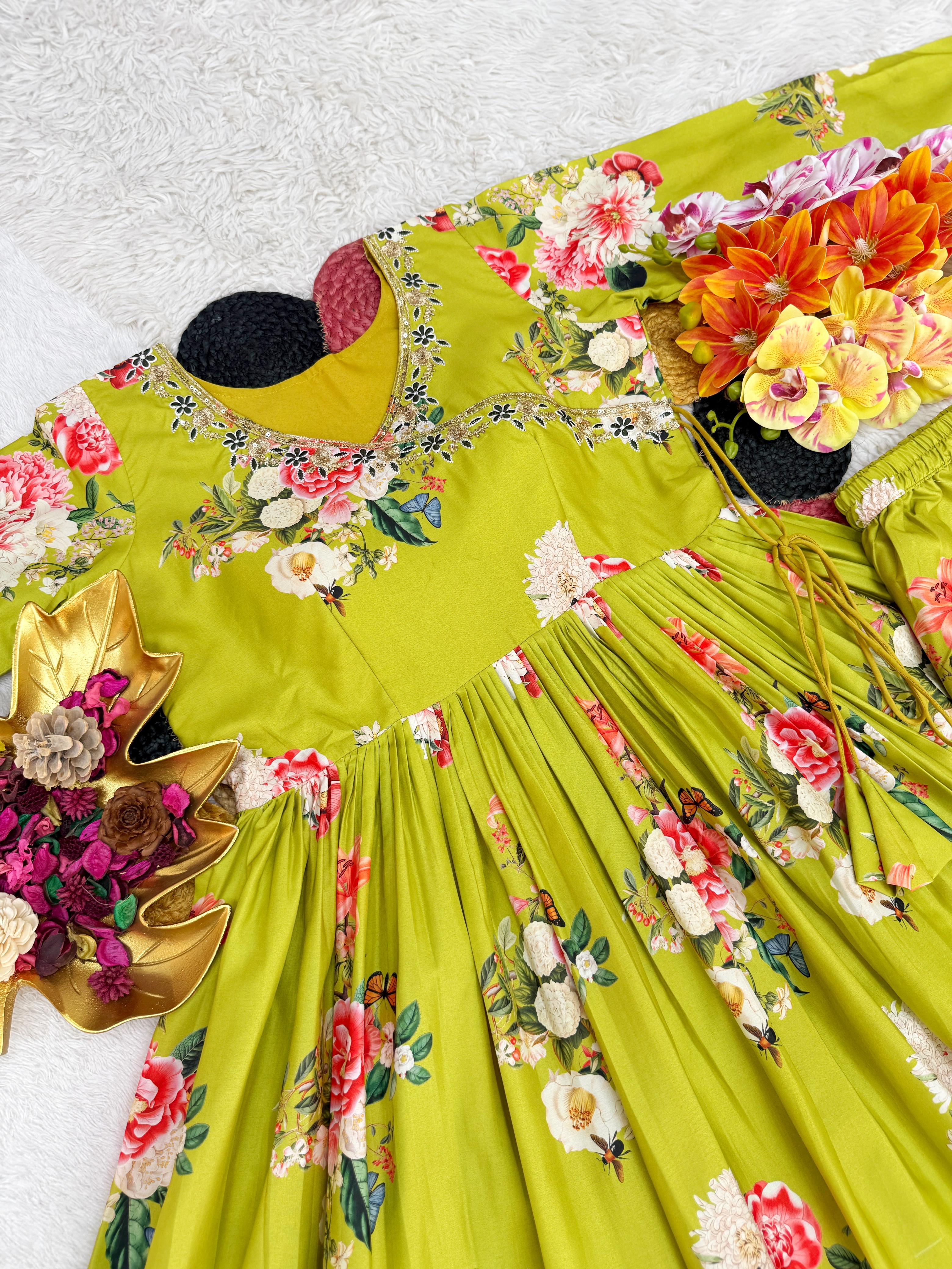 Capture the essence of Bollywood elegance with this trending Aditi Rao-inspired floral ensemble. Designed for the festive season, this set balances lightweight comfort with high-glamour sequins embroidery.