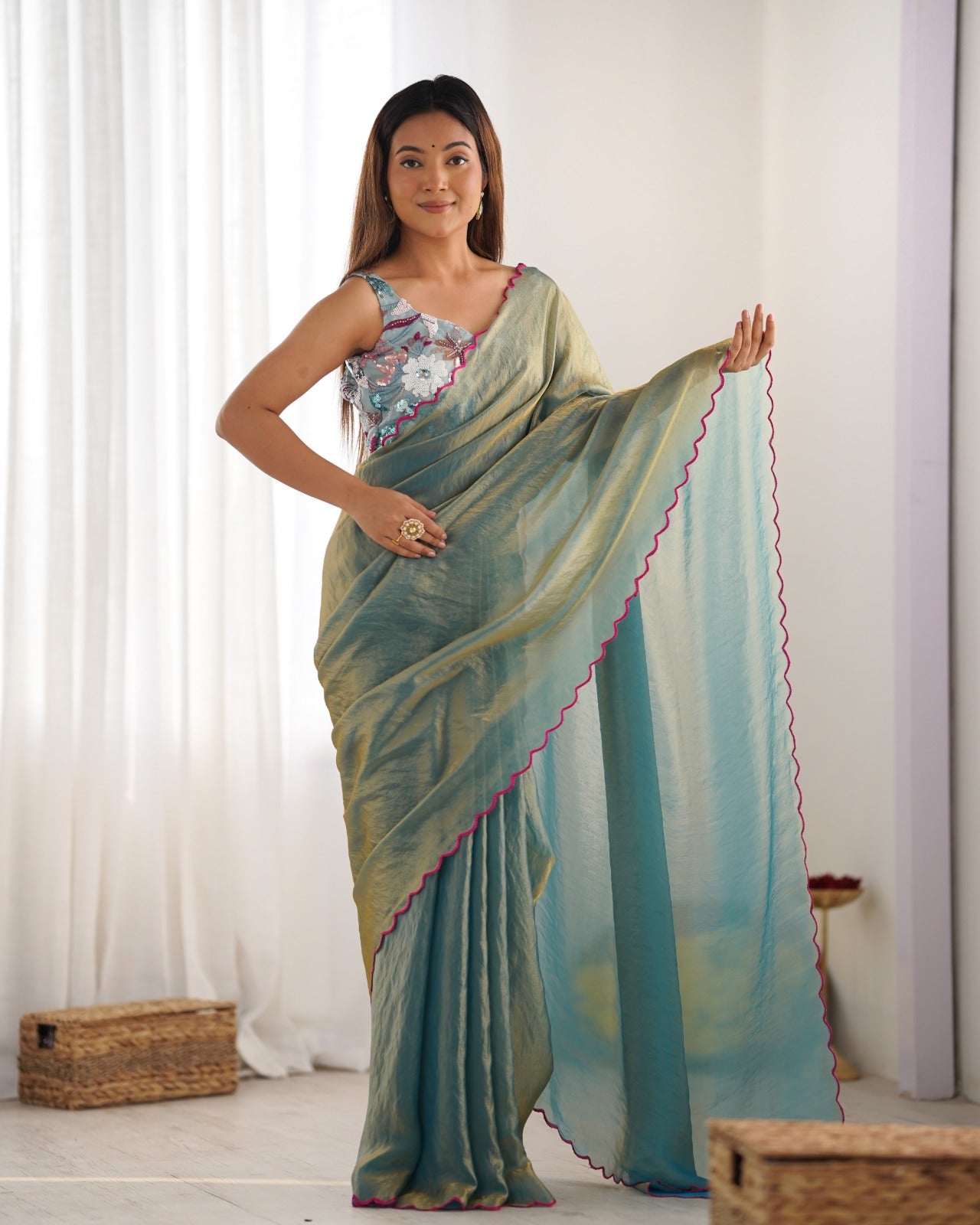 Elevate your style with this pure space silk saree with scalping border & designer beed blouse