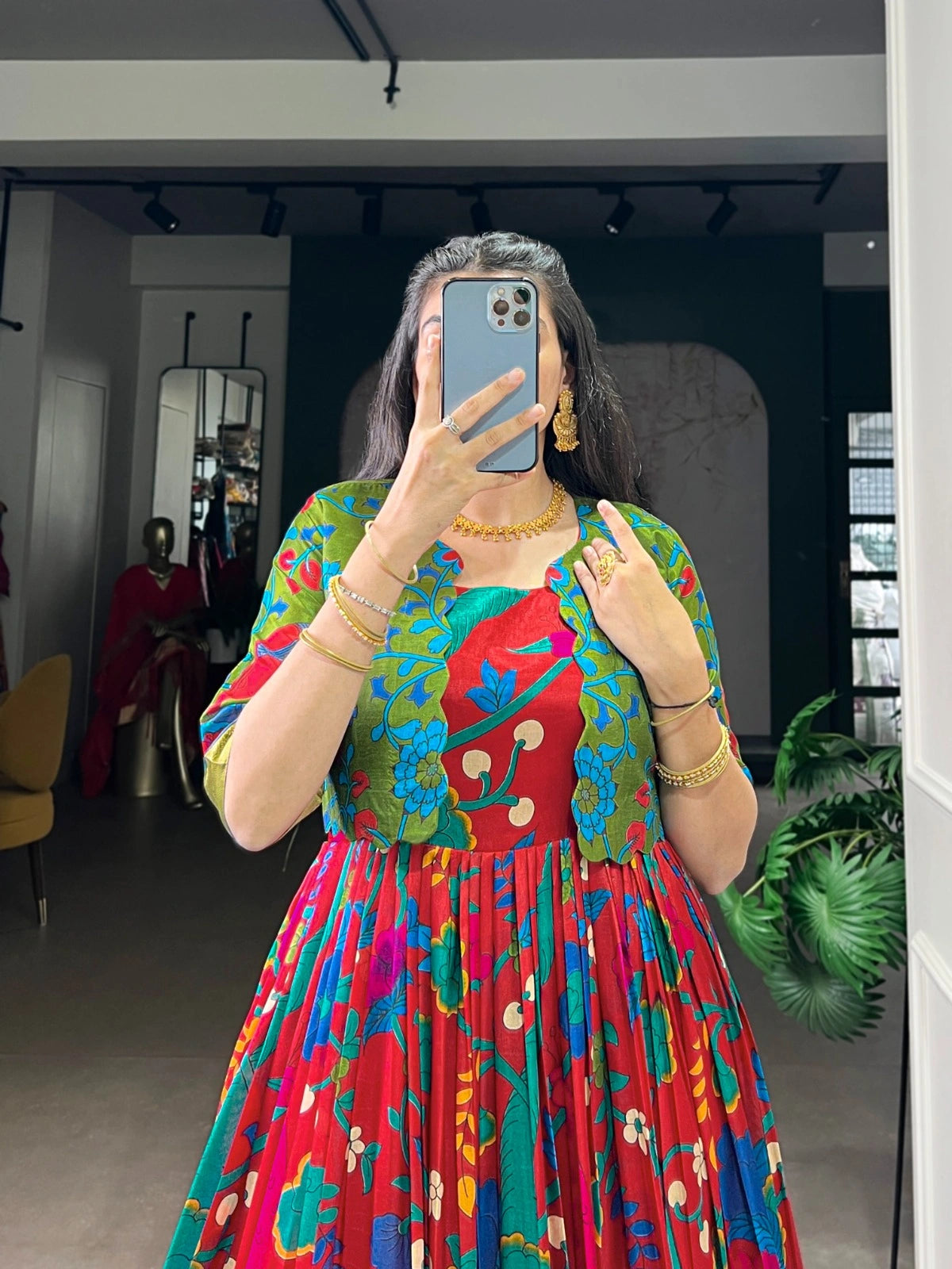 | Work | Kalamkari Print with Detailed Weaving Bold prints, flawless flare — a gown that makes every moment feel festive 🌸✨ |