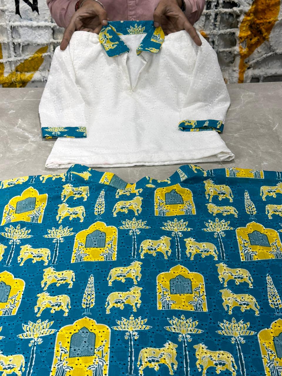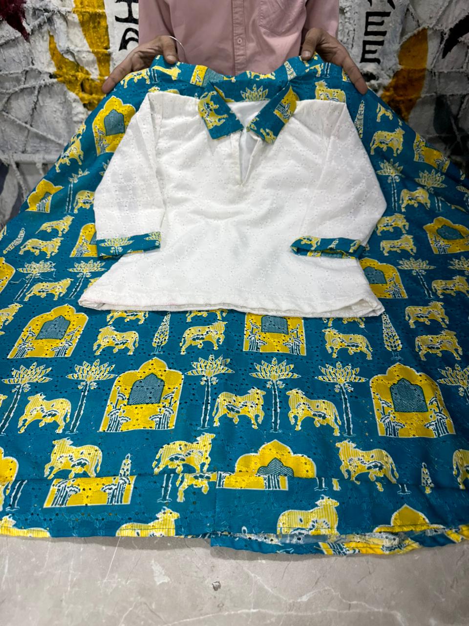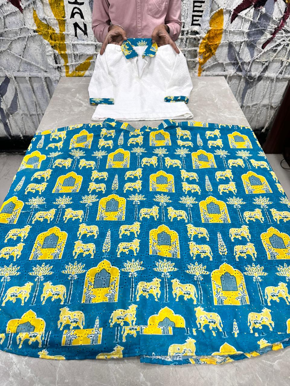 | Color Palette | Ivory White (Top) with Cerulean Blue & Mustard Yellow accents (Skirt) |