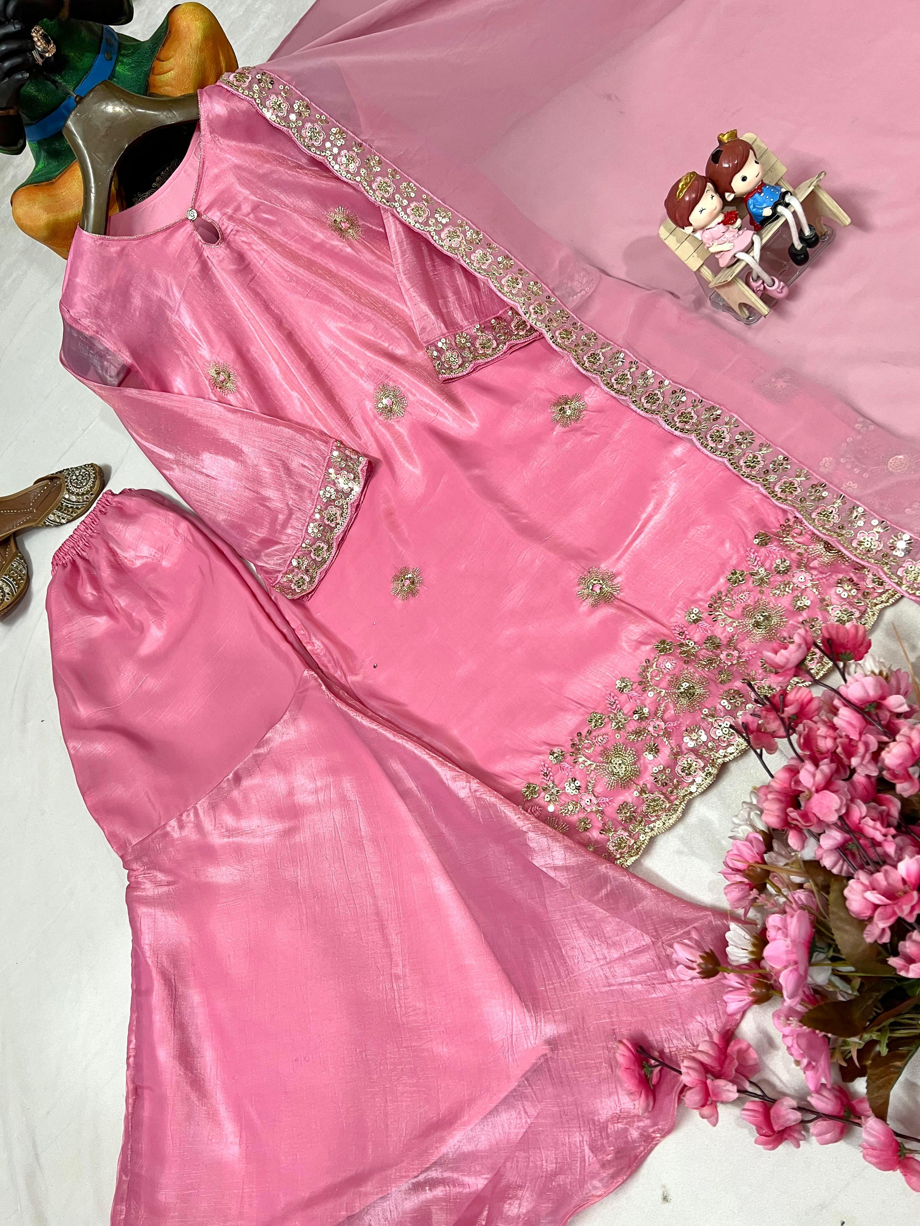 This ensemble features a beautiful Gold Crush Silk Kurti and Sharara, paired with a Georgette Dupatta, all adorned with intricate zari and sequin embroidery work.