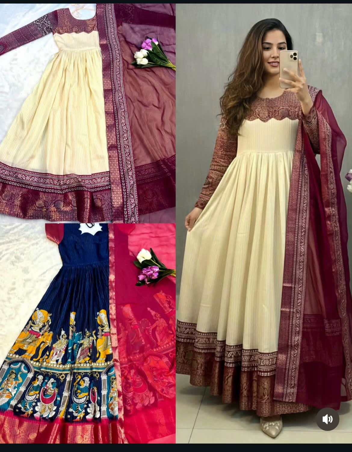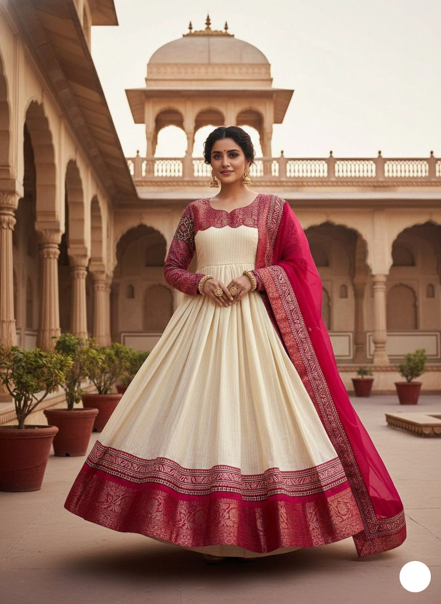 | Key Highlights | Luxurious Dola Silk, Wide Flair (4+ Mtr), Matching Jequard Borders, Complete Set |