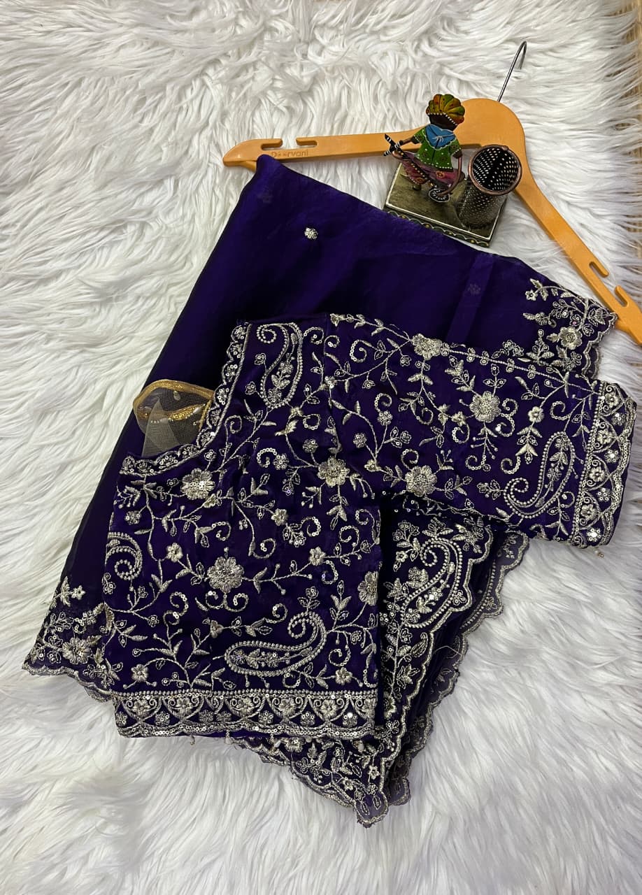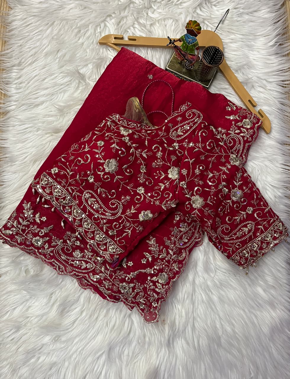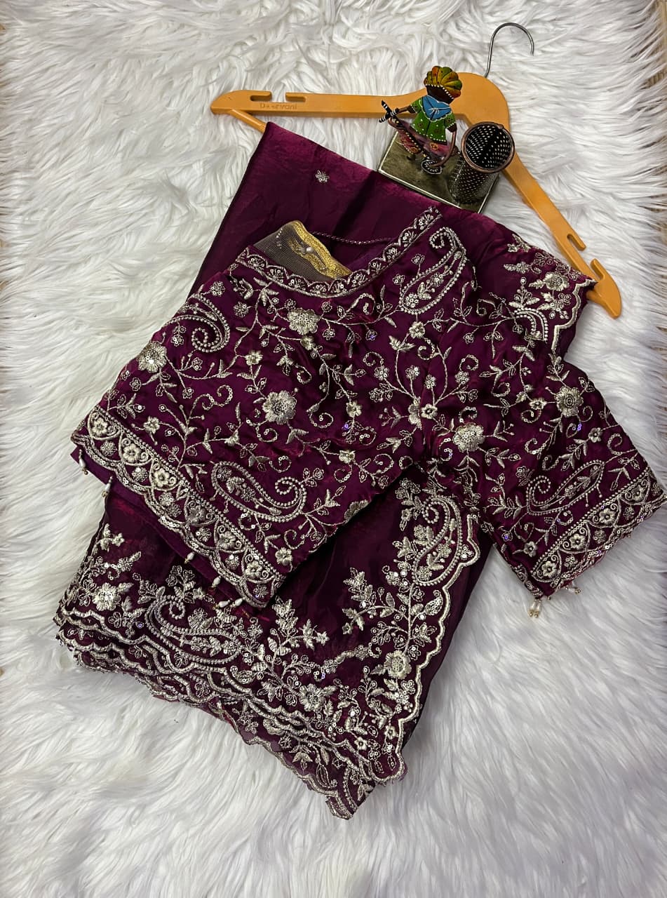 Premium Pure Space Silk Zari Sequence Mango Design Embroidery Work