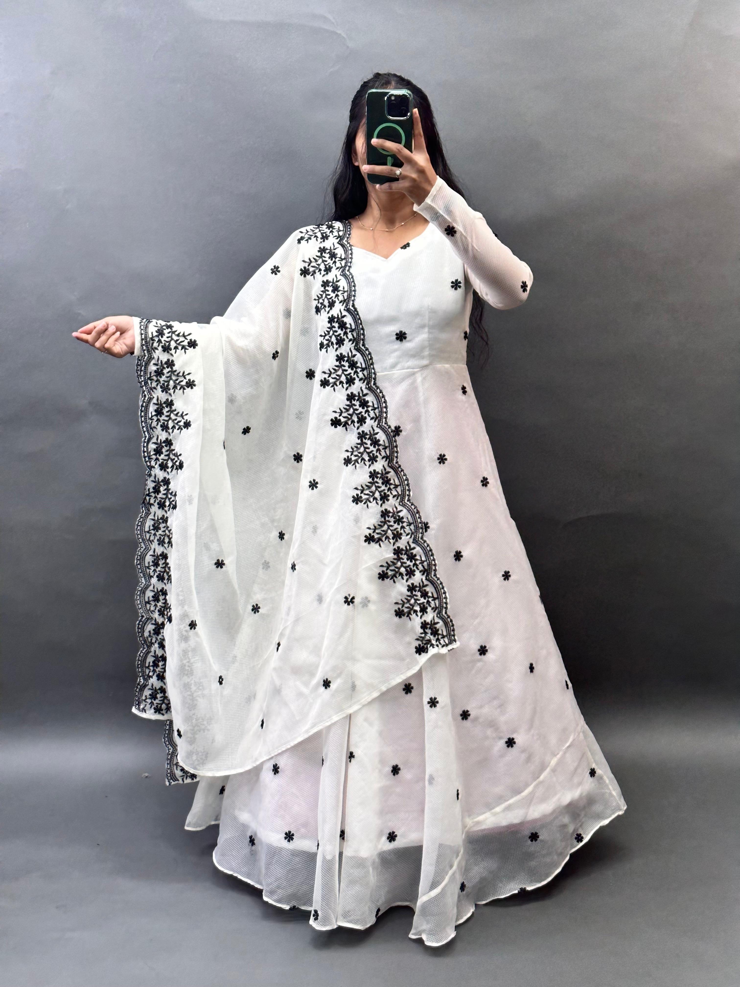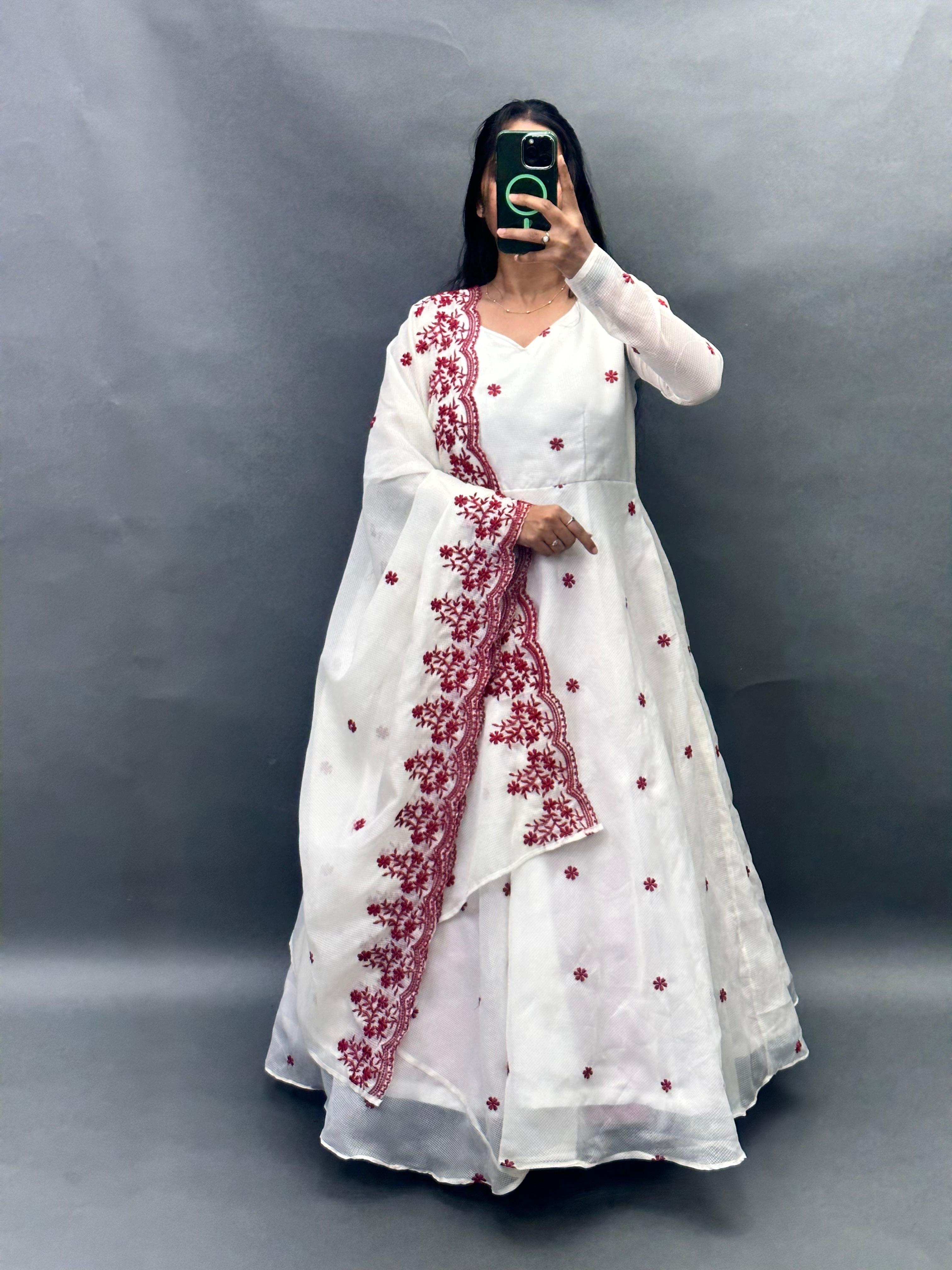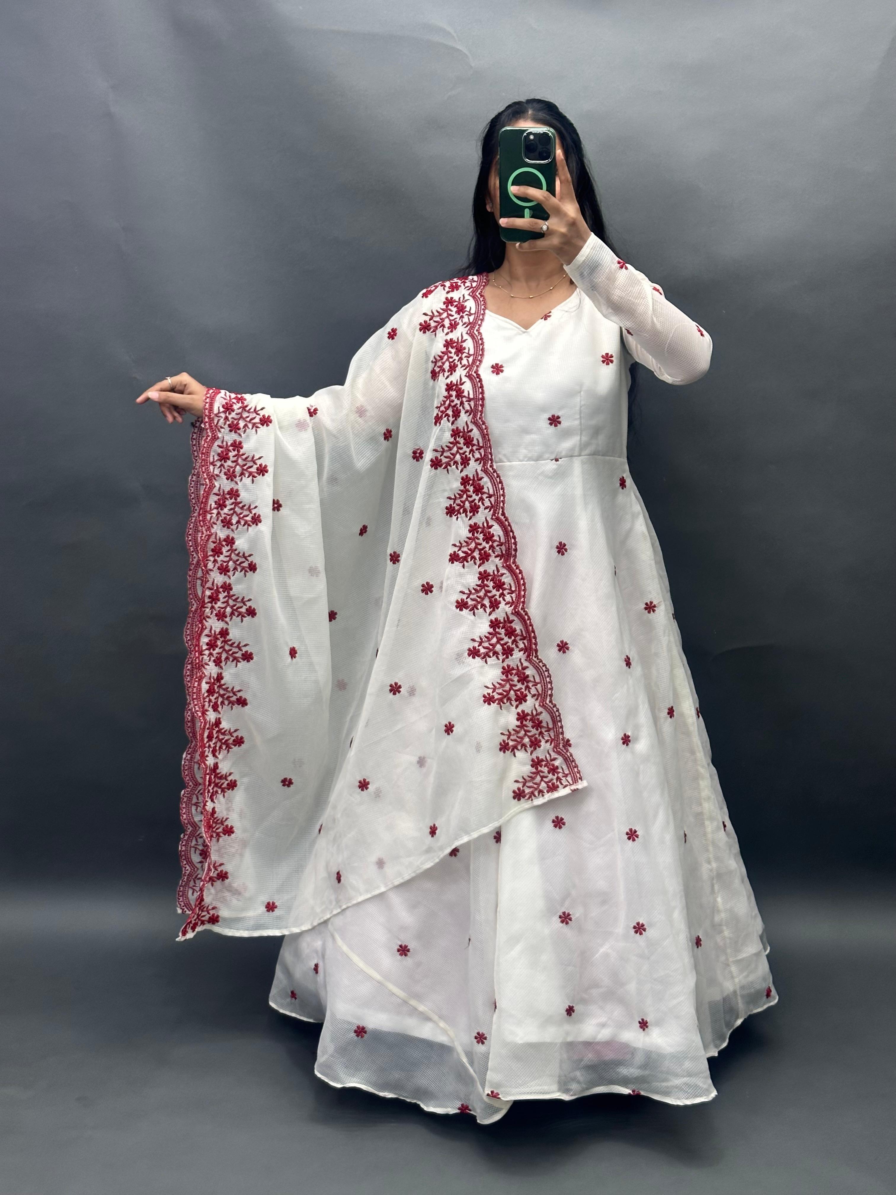 Workmanship Detailed floral thread embroidery and intricate  (Lace-style) borders on the dupatta.